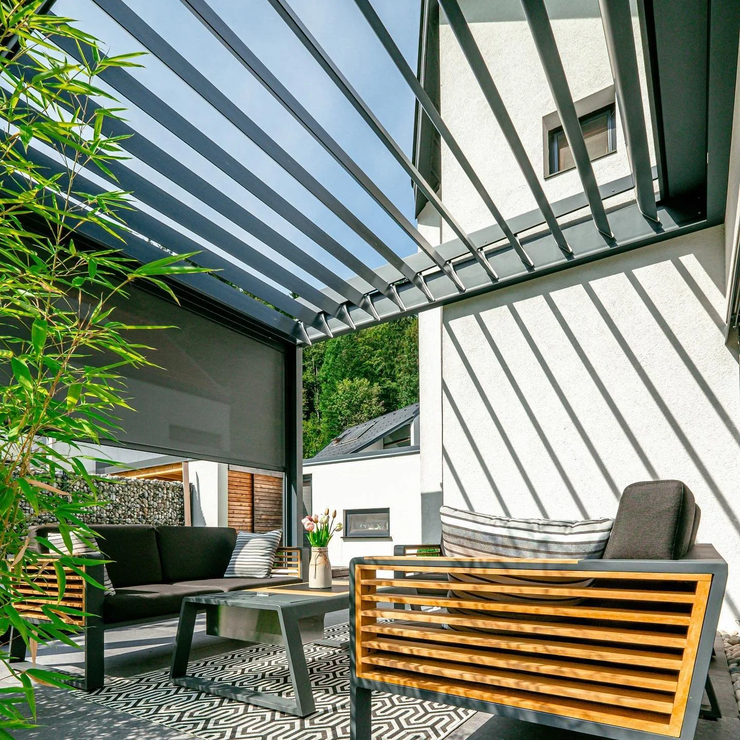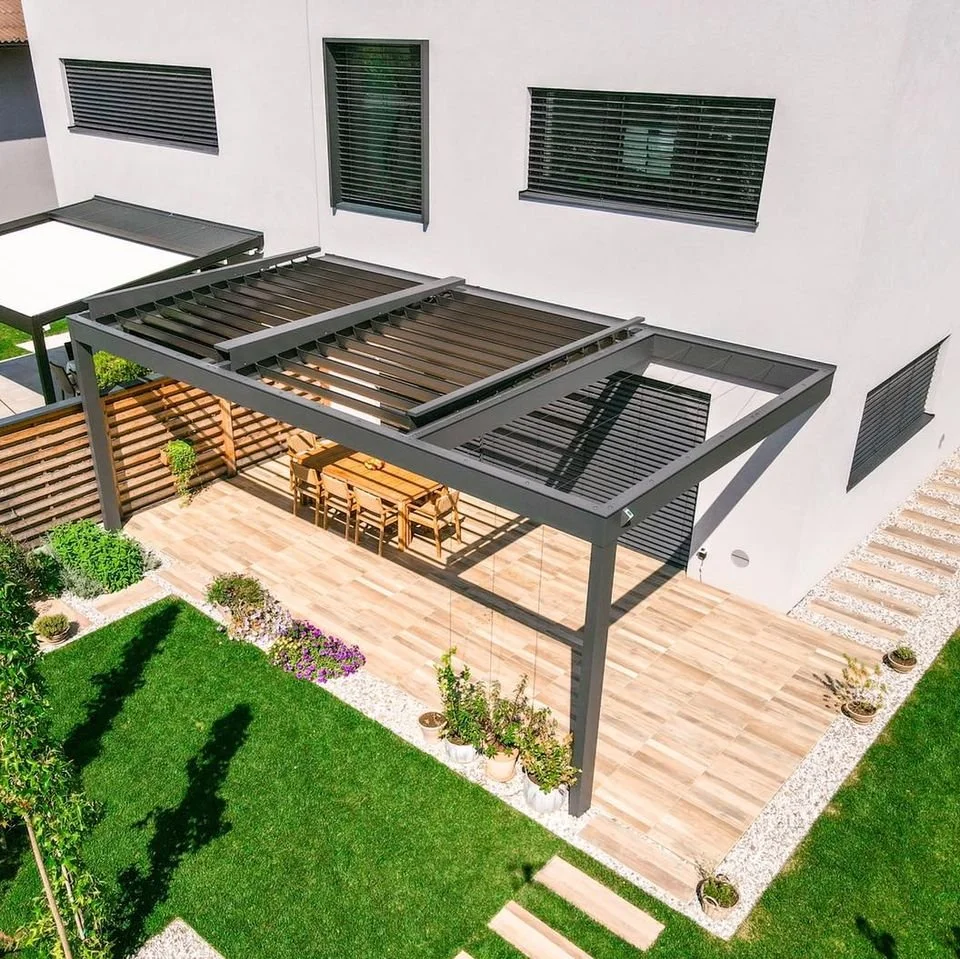 Hard-Top bioklimatska pergola oz. lamelna pergola je moderen arhitekturni element najvišje kvalitete, ki z motorno rotacijo lamel regulirano prepušča do 80% sonca kadar to želite, zadrži pomladanski ali jesenski naliv, vas ščiti pred vročim poletnim soncem in vnaša sonce ali ohrani teraso suho tudi pozimi.